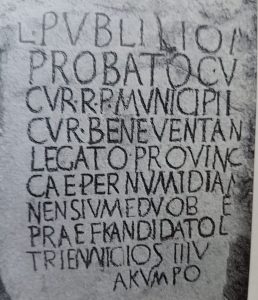Parla di un certo Pubblio Probato che non doveva essere uno qualsiasi per l’Impero di Roma visto che il “cippo” doveva essere la base di una statua in marmo, posta lungo una strada o ai lati di un “forum”, a lui dedicata. Ha un grande valore scientifico per gli studiosi. Per noi sommesi dovrebbe avere un grande valore documentale perché ci porta ai primissimi secoli dopo l’eruzione del 79 d. C. Era, ed è, una straordinaria testimonianza di qualcosa di importante relativo alla grandezza di Somma di epoca romana, sepolta nel 472 d. C., nota già prima dello scavo della cosiddetta Villa Augustea di questi anni.