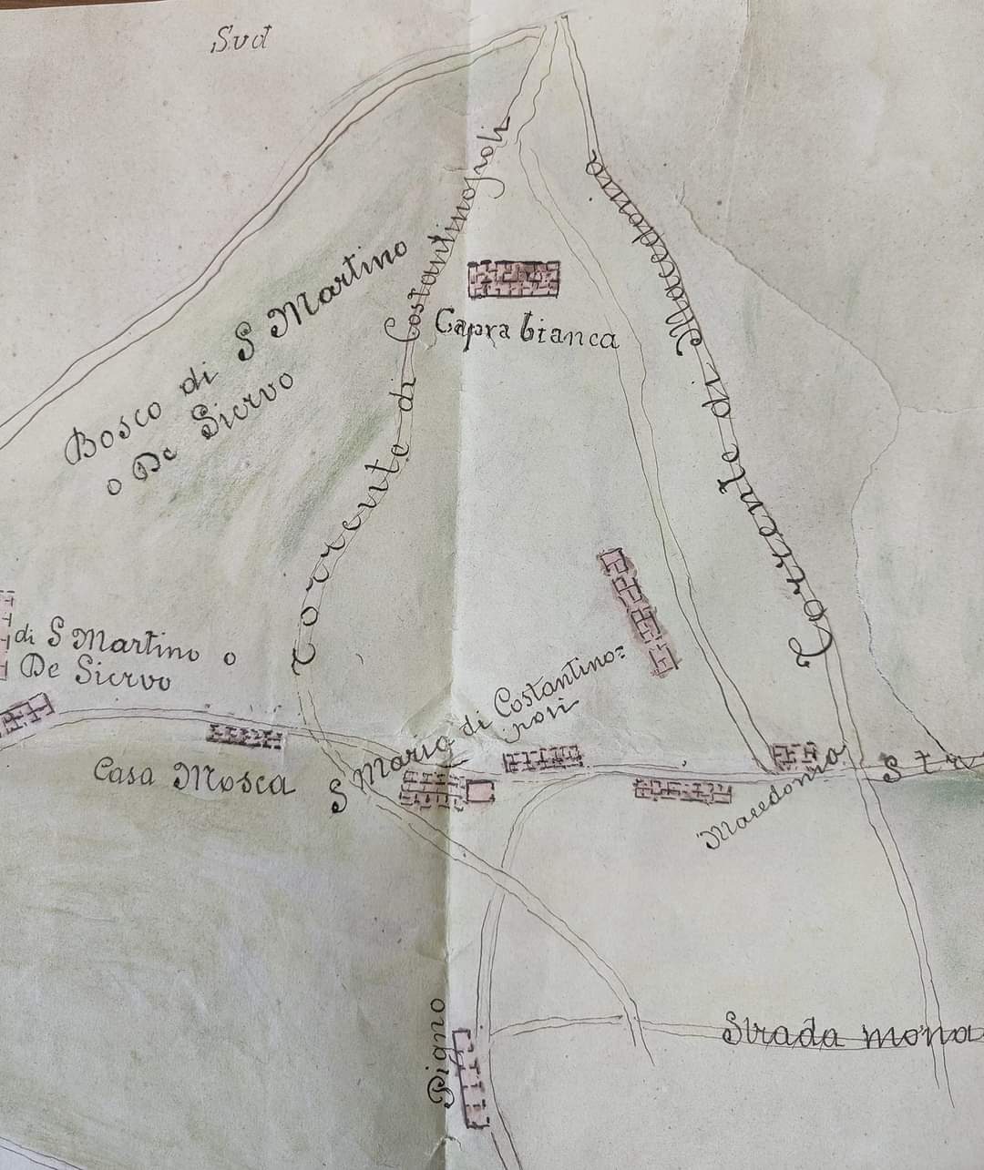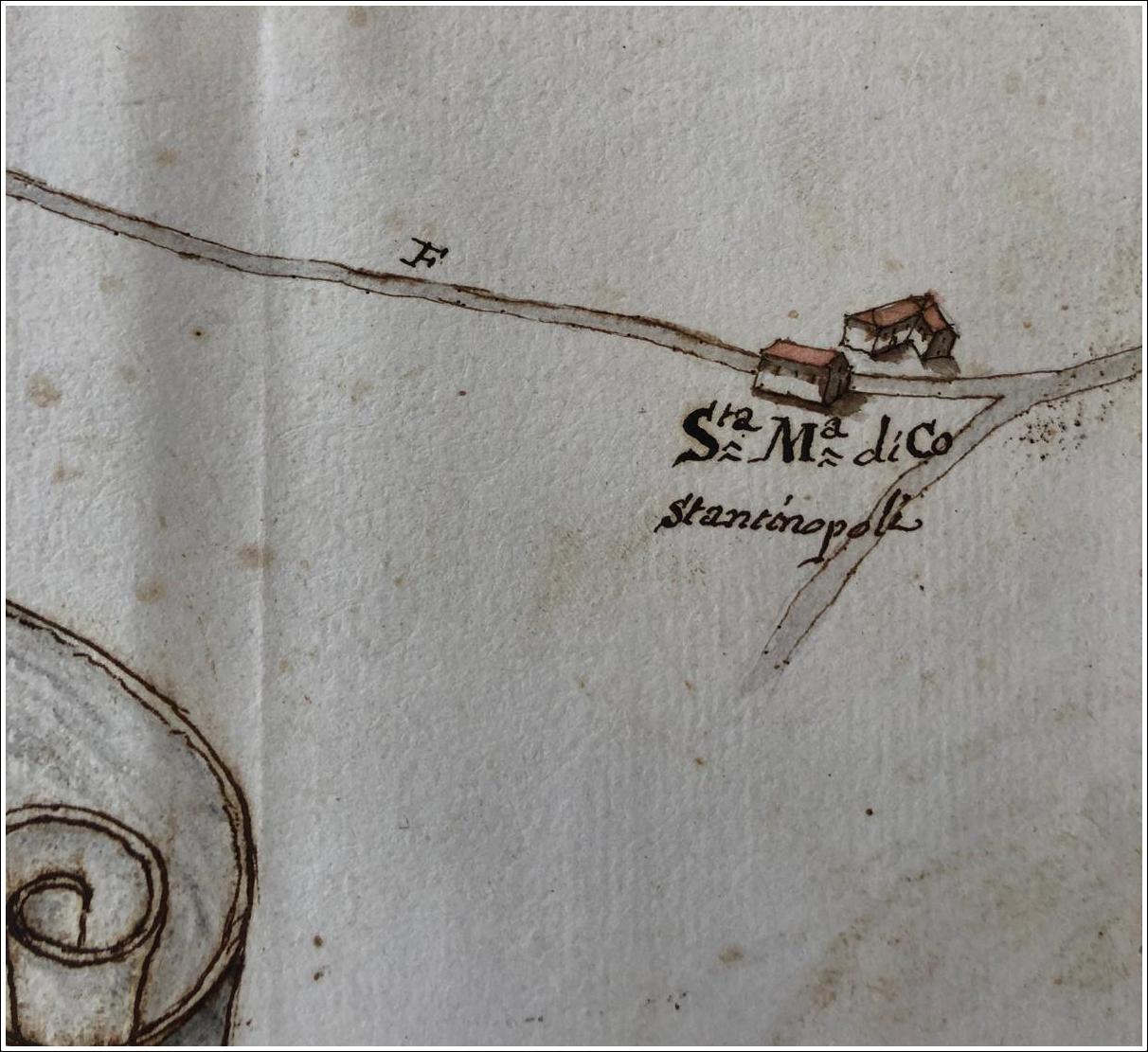 Due anni più tardi, 13 luglio del 1615, il Banco del Governo dell’Annunziata di Napoli pagò ducati quaranta a Scipione Galluccio a conto de la manifattura de uno altare de marmore che haverà da fare nella chiesa di S. M. di Costantinopoli di Somma. Quest’ ultima notizia viene riportata dall’archivista e studioso di storia napoletana cav. Giovan Battista D’Addosio (+1921) – segretario capo della Reale Santa Casa dell’Annunziata a Napoli per oltre trent’anni e curatore del Sommario delle pergamene – nella sua opera dal titolo Documenti inediti di artisti napoletani dei secoli XVI e XVII, Napoli, 1920, pag. 193. Scipione Galluccio (notizie 1588 – 1619) era un artigiano marmoraro di Cava de’ Tirreni, attivo a Napoli tra la fine del XVI e l’inizio del XVII secolo. Lavorava il marmo, spesso collaborando con altri noti artisti napoletani dell’epoca, tra cui Giovanni Antonio Dosio e Cristoforo Monterosso. Famoso era anche il fratello, Giovan Antonio Galluccio, con cui Scipione collaborò nella realizzazione della fontana dell’Università di Gragnano nel settembre del 1603. Nel 1613, quindi, ecco che appare per la prima volta menzionata una cappella titolata a Santa Maria Costantinopoli, appartenente alla SS.ma Annunziata di Napoli: una cappella rurale che serviva una masseria, non solo come luogo di culto, ma un vero e proprio fulcro della vita sociale ed economica di quella zona ai confini con Ottajano. In effetti, le suddette notizie concordano pienamente con quelle riportate dallo studioso sommese avv. Francesco Migliaccio (1826 – 1896) nelle sue Notizie inedite: l’antica chiesa di S. M. Costantinopoli era originariamente una piccola cappella in un luogo detto all’Arco, che stava per la strada in un trivio formante triangolo e dietro detta Cappella vi era la siepe che serrava un territorio della Casa dell’Annunziata di Napoli, la quale attendeva al mantenimento della cappelluccia.