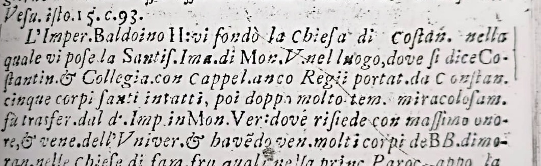 Lo storico Fabrizio Capitello, a pagina 158 del suo libro dal titolo Raccolta di Reali Registri, Poesie diverse et discorsi historici dell’antichissima, Reale & Fedelissima Città di Somma, Per Antonio Bortoli, Venetia 1705, addirittura, scrive fantasiosamente che la suddetta chiesa era stata fondata proprio da Baldovino II e nella quale vi pose la Santis(sima) Ima(gine) di Mo(nte) V(ergine) nel luogo dove si dice Costantin(opoli) […] poi doppo molto tem(po) miracolosam(ente) fu trasfer(ita) dal d(etto) Imp(eratore) in Mon(te) Verg(ine) dove risiede con massimo onore […]. Pura leggenda, ripeto, oltretutto mista ad una ricca fantasia dell’autore.