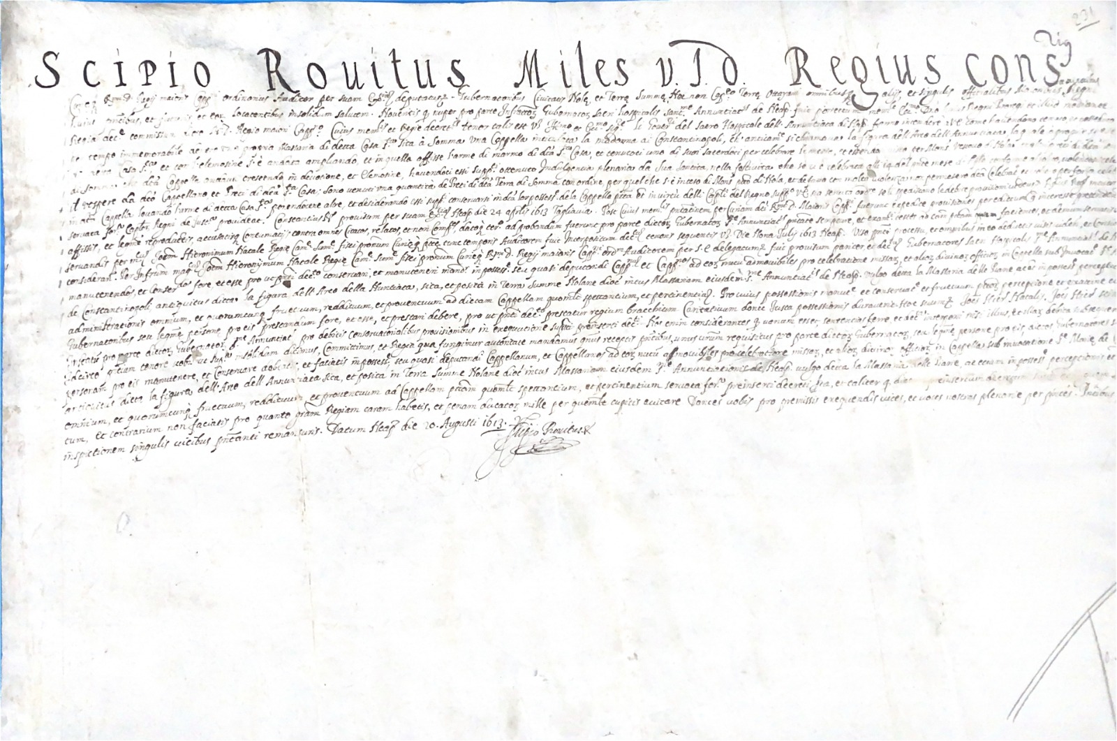 Precedentemente, però, il 20 agosto del 1613, un provvedimento del regio consigliere e utroque iure Scipione Rovito (1556 – 1636), consultore della Curia del Cappellano Maggiore, ordinò che il Sacro Ospedale dell’Annunziata AGP con i suoi religiosi era mantenuto nel possesso di una cappella sita et posita in terra Summe Nolanae dioc(esis) intus Massariam eiusdem S.ma Annuntiatis de Neapoli vulgo detta la Masseria delle Piane. Una notizia straordinaria emersa di recente dalle pergamene dell’Archivio della Real Casa Santa dell’Annunziata. Da tempo immemorabile, infatti, la Casa Santa possedeva, in una propria masseria, una cappella intitolata Madonna di Costantinopoli, ch’anticam(en)te si chiamava la figura dell’Arco dell’Annunziata, la quale a proprie spese di detta Casa S(an)ta, et con l’elemosine s’ è andata ampliando et in quella affisse l’arme di marmo di d(et)ta S(an)ta Casa, et tenutosi uno dei suoi sacerdoti per celebrare le messe […]. Il Vescovo di Nola, mons. Fabrizio Gallo, ragguagliato dal clero locale che detta Cappella andava crescendo in devozione et elemosine, havendoci essi supplicanti ottenuto Indulgenza plenaria da Sua Santità [Paolo V] nella festività che se vo celebrare alli 14 del presente mese di agosto, tentò di prendere il controllo delle celebrazioni, che, comunque, spettavano al cappellano e ai sacerdoti della Santa Casa dell’Annunziata. Il dissenso dei presbiteri locali non tardò ad arrivare: una quantità de preti di d(et)ta Terra con ordine […] con molta violenza non permesero dicta celebrazione […] levando l’arme di detta Casa Santa ponendove altre. La Casa Santa dell’Annunziata ricorse, quindi, al Cappellano Maggiore affinché fosse appianata la questione in virtù degli antichi Capitoli del Regno. Il caso, comunque, si risolse con una provvisione del 20 agosto del 1613, in cui fu stabilito che la Casa Santa aveva la facoltà di esigere e poter amministrare senza l’ingerenza del clero locale [Archivio dell’Annunziata di Napoli, album 3, RIP. 0045].