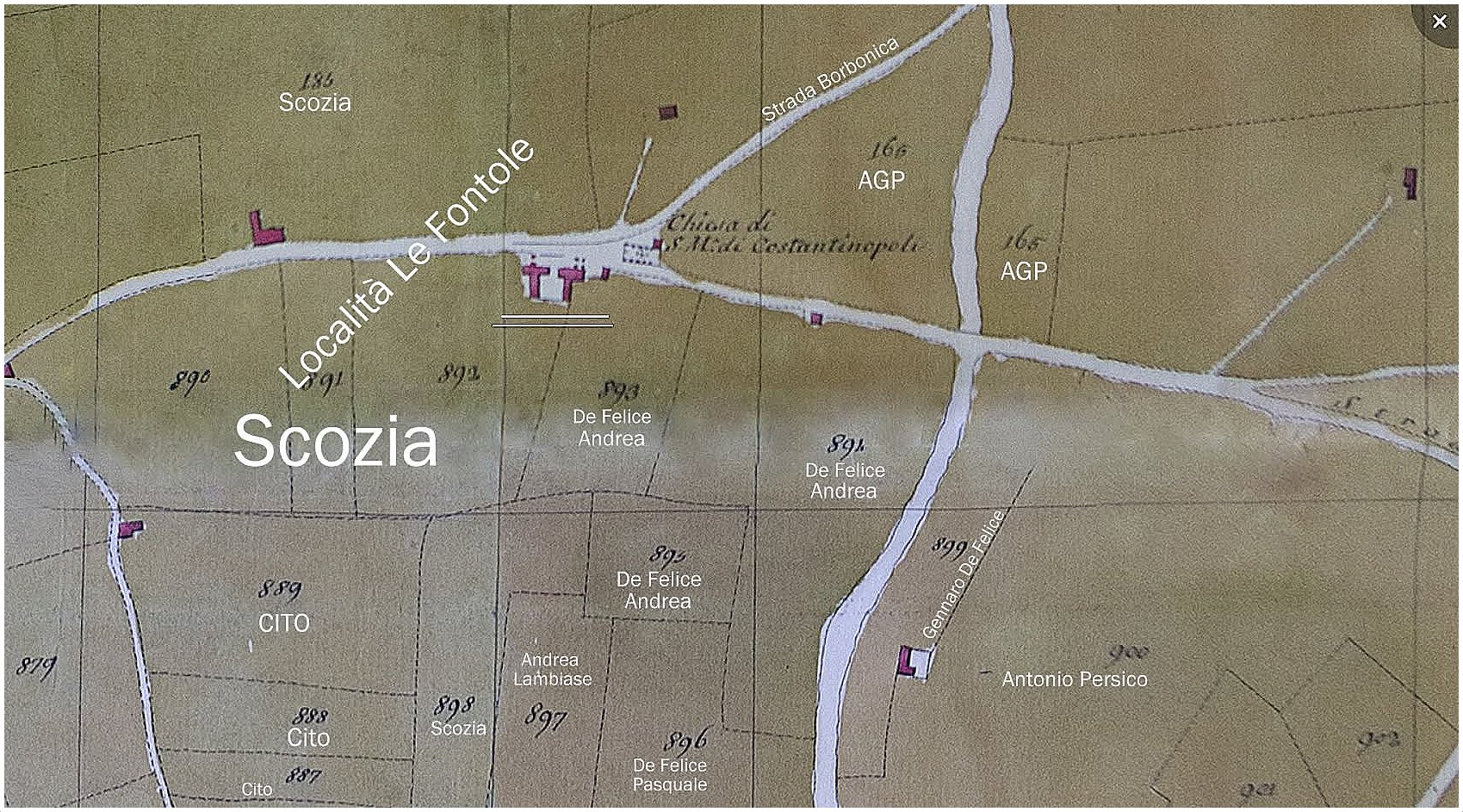 Nel 1658 vi si celebrava la messa per divozione del Cantore Can. Francesco Roselli. Nel 1744, epoca della redazione del Catasto Onciario borbonico, non solo appare il geotoponimo le Fontole, la località ad ovest della cappella; ma risulta che la Casa Santa dell’AGP di Napoli possedeva annui ducati venticinque e grana 60 per causa di censo sopra il territorio detto Costantinopoli se li corrispondono da Giovanni Aliperta del quondam Bonaventura. Nel 1800, a conferma della suddetta notizia, tale possedimento dietro la chiesa, di circa sei moggia, era censito al figlio di Giovanni, Bonaventura Aliberta (Aliperta); inoltre i numerosi vigneti, che la circondavano, appartenevano alla maggiore nobiltà e notabilità cittadina: Scozia, Cito e de Felice [L. Marchese, Pianta di Somma, Museo di Capua, 1800-01].