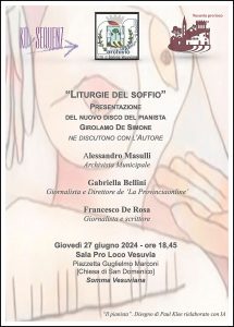 Il pregevole lavoro del musicista sarà presentato a Somma Vesuviana nella Sala Pro Loco Vesuvia in piazzetta Guglielmo Marconi (piazzetta San Domenico) giovedì 27 giugno a partire dalle ore 18:45 nell’ambito della rassegna della Pro Loco Vesuvia dal titolo Racconto Somma. Discuteranno con l’autore: il giornalista e scrittore Francesco De Rosa; la giornalista e direttore de La Provinciaonline, Gabriella Bellini; l’archivista municipale Alessandro Masulli. Per l’occasione sarà inaugurata, anche, la sezione della Biblioteca dell’Archivio storico cittadino, collocata nella splendida sede della Pro Loco Vesuvia, e dedicata al compianto prof. Lorenzo Ferrara, educatore di tante generazioni di studenti sommesi. Un ringraziamento doveroso all’imprenditore e uomo di cultura Mario Sodano per la donazione della targa. Saranno presenti la moglie, prof.ssa Annamaria Mandarano, e il figlio. Dopo la presentazione del cd si terrà la rassegna Clown & Benessere con giochi, musica e stand di prodotti tipici nel chiostro di San Domenico.