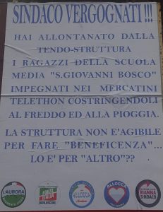 Eccola, la replica del sindaco: «Mi hanno riferito di un manifesto pieno di bugie, mi viene da pensare che si tratti di menzogne indotte da qualcuno che aspira a diventare leader pur non venendo dal mondo politico. A voi cittadini devo soltanto la verità, per cui in riferimento ai “Mercatini Telethon” organizzati dalla scuola “San Giovanni Bosco”, che si sono svolti domenica 3 dicembre, l’autorizzazione concessa dal Comune riguardava solo gli spazi antistanti il plesso centrale dell’istituto e (nel caso i banchi di allestimento fossero stati in numero esuberante rispetto allo spazio di occupazione richiesto) si autorizzava anche a farli montare nell’area di parcheggio laterale all’istituto. Nessuno era stato autorizzato, invece, a usufruire della tensostruttura, che da oggi è ufficialmente agibile. Quando mi sono accorto che era stata aperta in maniera abusiva sono intervenuto per garantire l’incolumità degli alunni e dei genitori. Sono altri che dovrebbero imparare il senso della vergogna, non certo io. Gli atti autorizzativi a firma del dirigente al ramo, con data 01/12/2017 e nr. prot. 0023601 sono disponibili a tutti».