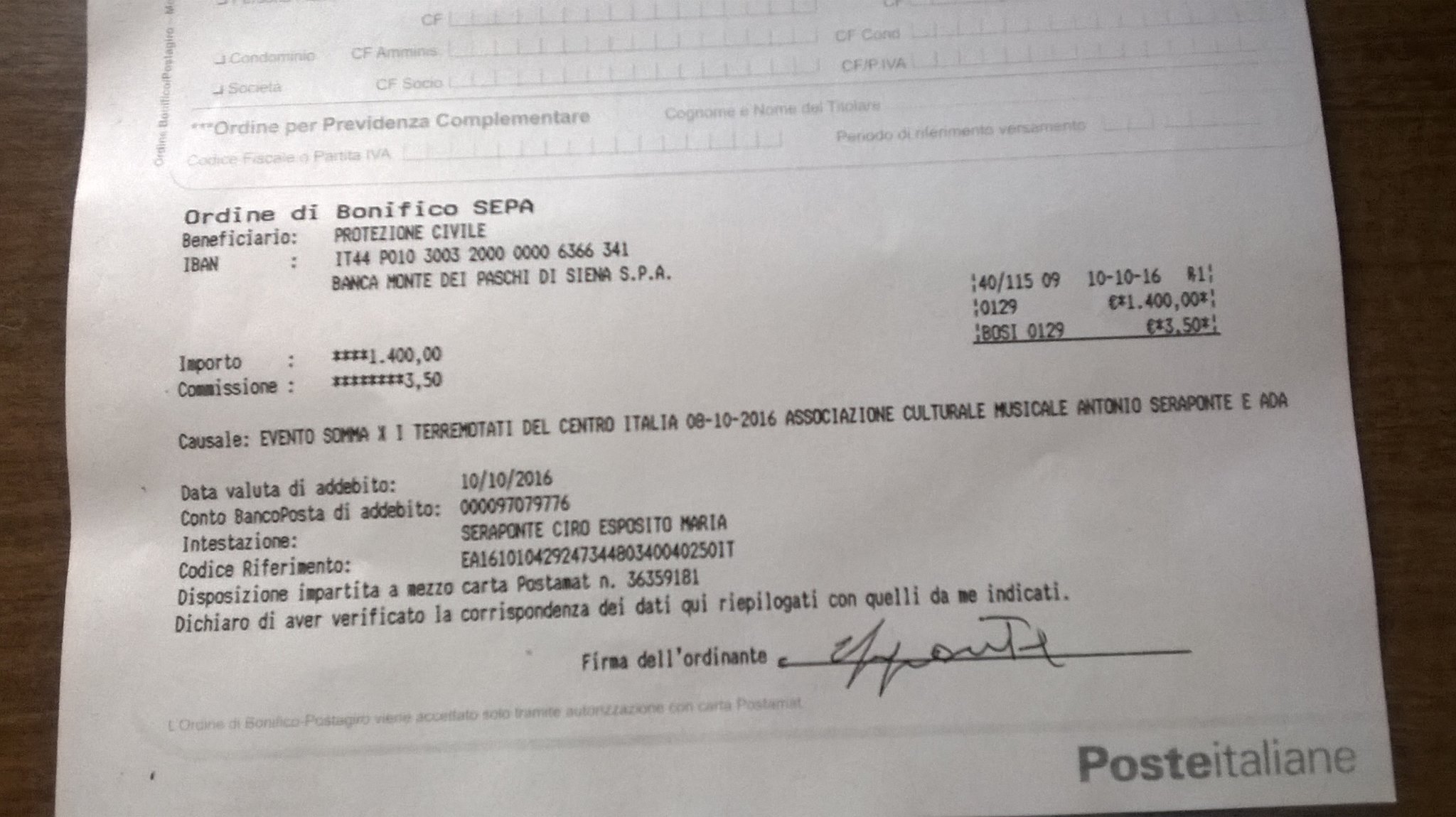 I contributi raccolti ammontano a 1700 euro dai quali sono stati sottratti i costi dei teloni e delle funi, nonché delle vettovaglie per l’accoglienza. Il 10 ottobre, due giorni dopo l’evento, è stato effettuato un bonifico di 1400 euro alla Protezione Civile Nazionale (IBAN – IT44 P010 3003 2000 0000 6366 341). «Non sono tantissimi, ma nemmeno pochi – continua Seraponte – ringraziamo tutti coloro che hanno voluto partecipare, sapendo che una quantità di mattoni occorrenti per la ricostruzione dei paesi colpiti, che ci auguriamo sia veloce, sarà comprata con i fondi da noi inviati».