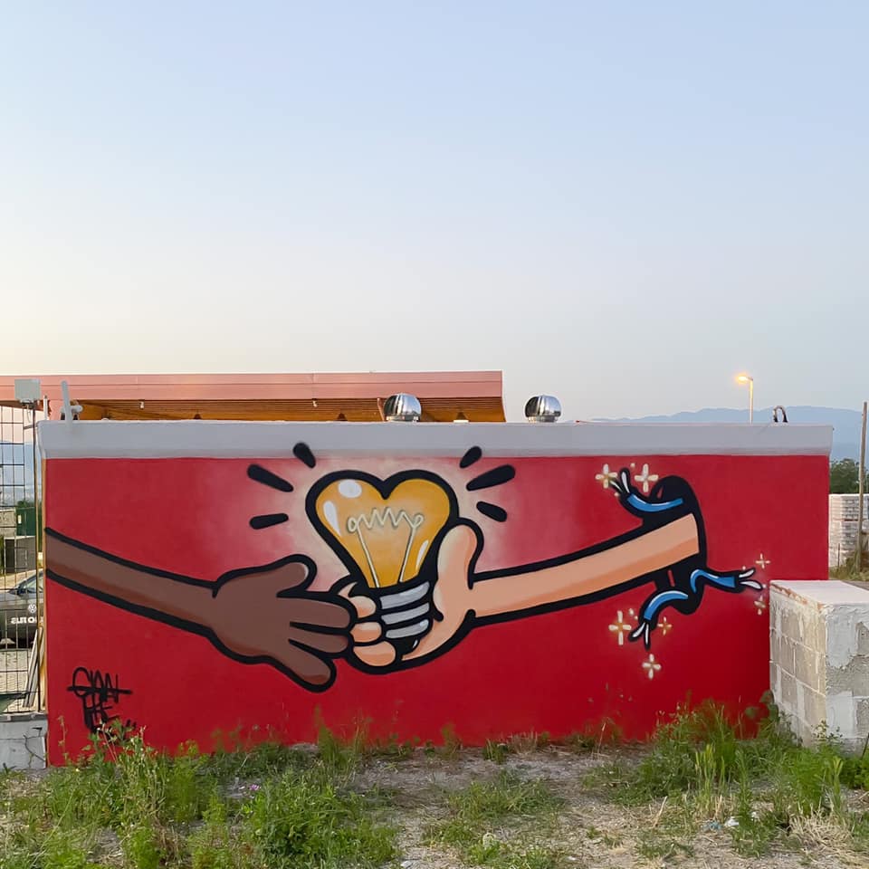 Una vera e propria opera d’arte nasce dalla creatività di Gianpiero D’Alessandro che ha portato in giro per il mondo il suo stile innovativo e moderno. Su uno sfondo per metà rosso e per metà giallo spiccano due mani, simbolo di due etnie differenti, che si uniscono proprio grazie ad una lampadina accesa a forma di cuore, mentre un interruttore è impostato in modalità “on”. Il messaggio è chiaro: «L’amore è quella cosa che dà energia a tutto il resto. L’amore è uguaglianza. L’amore è rispetto. L’amore è tutto! Turn on the love», così l’artista spiega il concetto trasformato in murales a colpi di bombolette spray.
