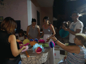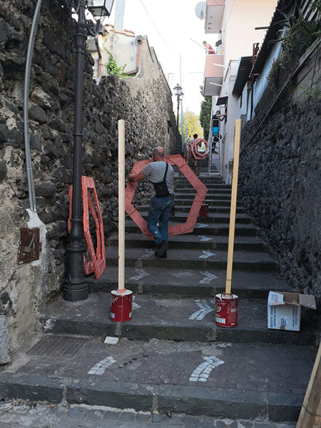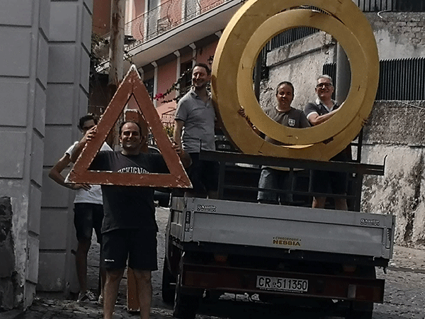 Mentre scriviamo, la comunità del Casamale è all’opera per l’allestimento. Si lavora senza sosta, c’è molto da fare. Donne, bambini, giovani e giovanissimi si occupano delle bandierine: ago, filo, forbici, spillatrici, nastro isolante, filo di ferro, nastri: i cortili diventano laboratori di festoni e bandierine. Ai “masti di festa” il compito di costruire e laccare le sagome geometriche, sistemare in tutti i nove vicoli del borgo le strutture di legno , i pali, reperire l’olio per le migliaia di lucerne da sistemare sulle forme; andare in montagna per raccogliere le ginestre, spostarsi per cercare le felci per poi intrecciarle. Si svegliano all’alba e attrezzi alle mani si mettono all’opera. Stremati dalla fatica ma pieni di adrenalina per la festa che si fa sempre più vicina, li senti ridere, canticchiare. Si danno la voce e si riconoscono dal contranome familiare : O Pacchianiello, Piccion, Mast Affonz, O ulivar, Quatturan, Panettier, Mundlion,Ciccarò…