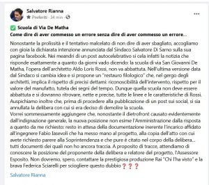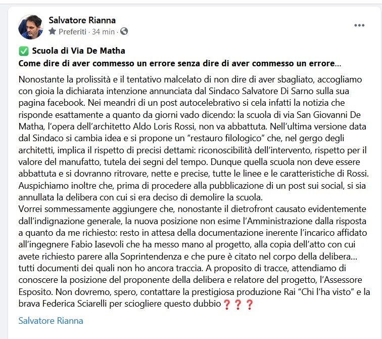 Due post social sulla vicenda della scuola di via De Matha, opera dell’architetto Aldo Loris Rossi, hanno portato novità. Il sindaco Salvatore Di Sarno – sulla sua pagina ufficiale – fa marcia indietro e sembra aver già archiviato la demolizione della struttura approvata in giunta e proposta dall’assessore Esposito; il consigliere di opposizione Salvatore Rianna, in un post di replica precisa che, prima di scriverlo su Facebook, la delibera di giunta andrebbe annullata ma aggiunge: “Accogliamo con gioia la notizia, ma nonostante il dietrofront attendo l’ufficialità e tutta la documentazione già richiesta”.