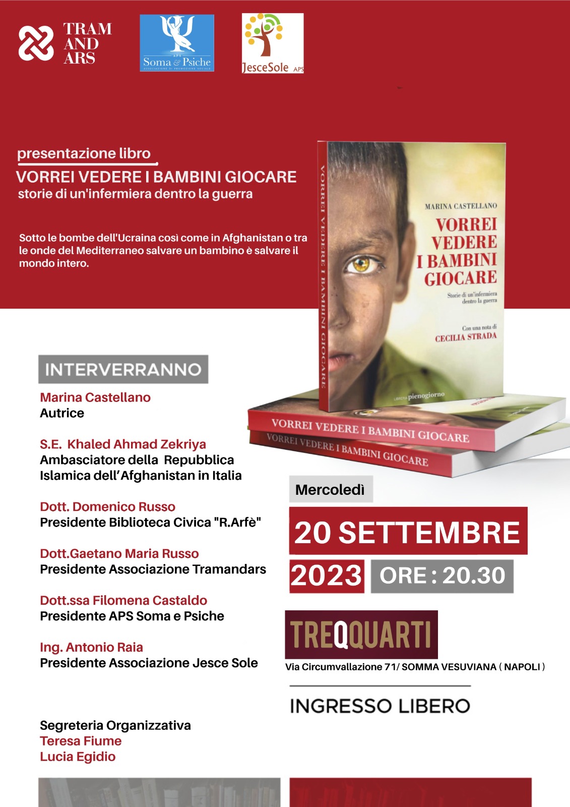 Mercoledì 20 Settembre 2023 alle ore 20:30 , presso Treqquarti sito in Via Circumvallazione n 71,Somma Vesuviana – Napoli, il gruppo di Associazioni Tramandars, Soma & Psiche APS e Jesce Sole ospiteranno Marina Castellano autrice del libro “Vorrei vedere i bambini giocare”.