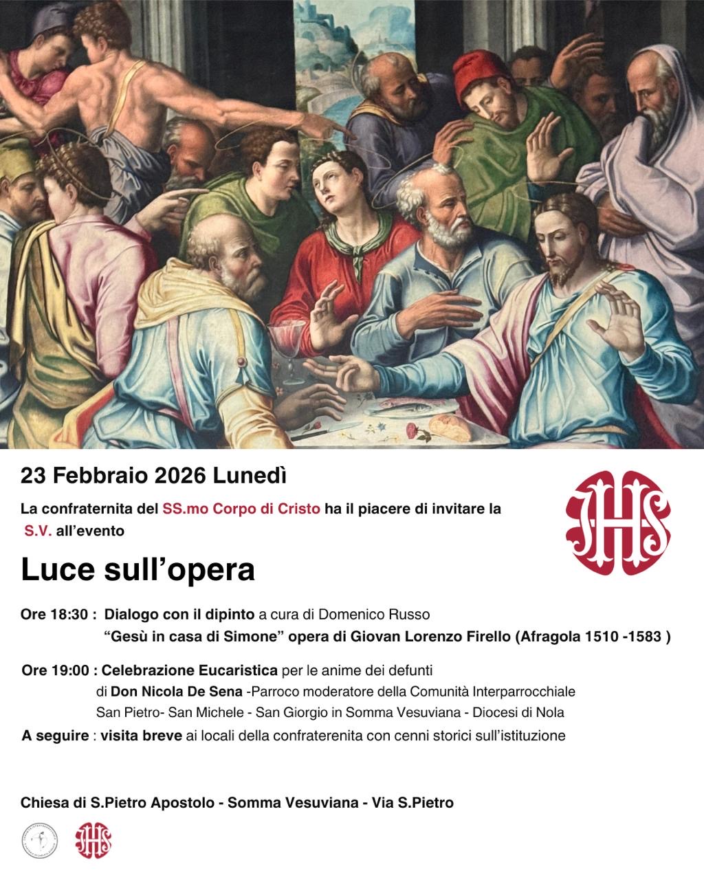 Somma Vesuviana, 23 febbraio 2026 – La Confraternita del SS.mo Corpo di Cristo è lieta di invitare la cittadinanza all’evento culturale e spirituale “Luce sull’opera”, in programma lunedì 23 febbraio 2026 presso la Chiesa di San Pietro Apostolo in via San Pietro, a Somma Vesuviana.