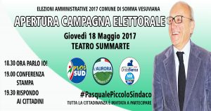Giovedì 18 Maggio 2017 alle ore 18:30 al teatro Summarte di Somma Vesuviana il candidato sindaco Pasquale Piccolo aprirà la sua campagna elettorale.