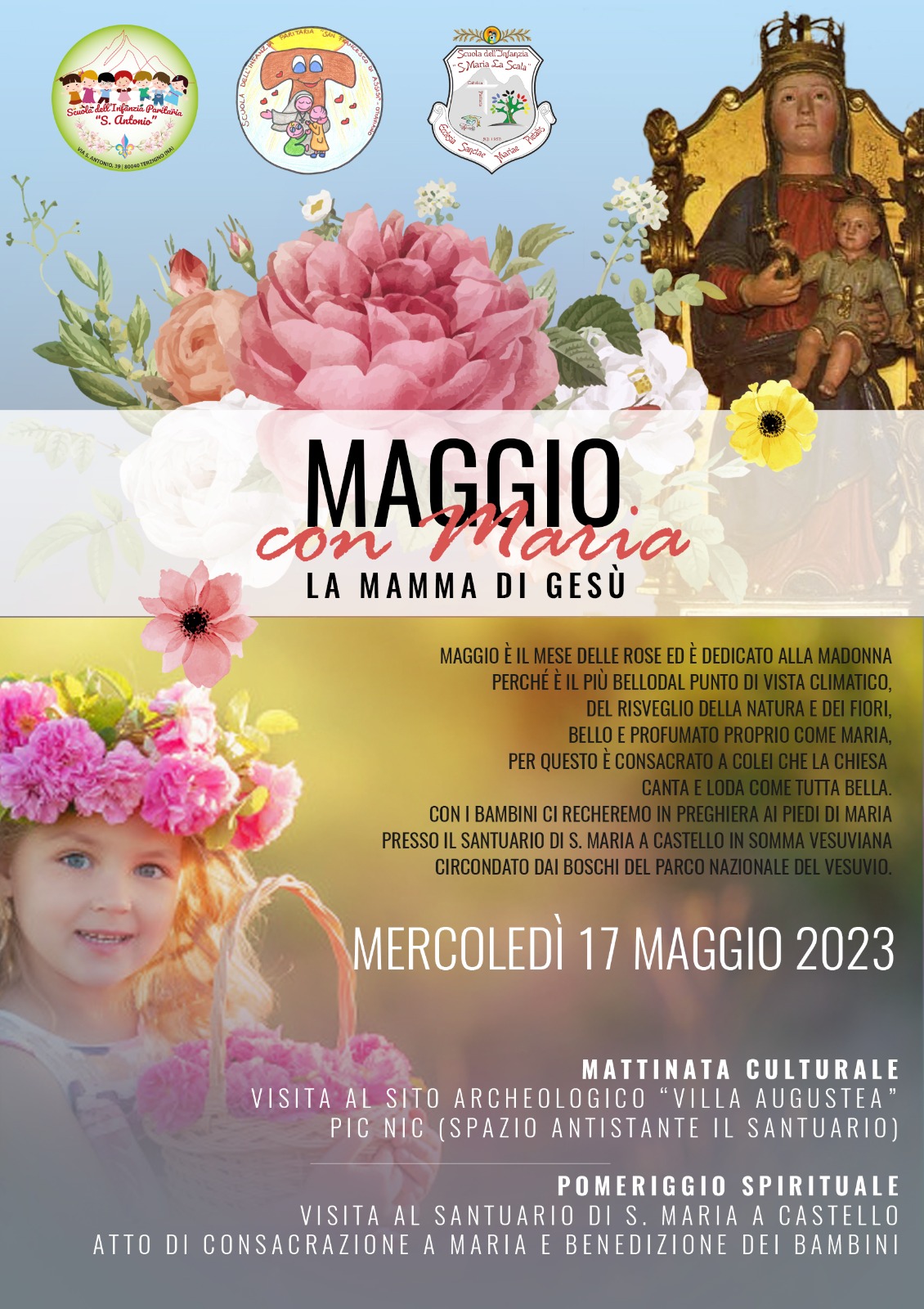 Mercoledì 17 maggio i bambini dell’infanzia delle Scuole cattoliche paritarie Santa Maria la Scala in San Giuseppe Vesuviano, San Francesco di Assisi in Ottaviano e Sant’Antonio in Terzigno vivranno una giornata culturale e spirituale nella Città di Somma Vesuviana.