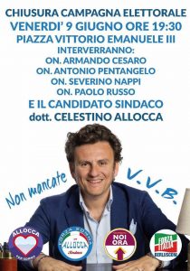 La piazza Vittorio Emanuele III avrà stasera le bandiere tricolori e quelle con il Cuore di Celestino Allocca per la chiusura di campagna elettorale del candidato che ha con sé quattro liste (Fi, Allocca per Somma, Forza Somma e Noi Ora). Start alle 19, 30 con il candidato sindaco circondato da numerosi primi cittadini del comprensorio vesuviano e nolano, consiglieri regionali, deputati ed esponenti di Forza Italia.