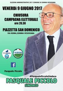 Mezz’ora più tardi, alle 20, inizierà l’ultimo comizio di Salvatore Di Sarno (Udc, Psi, Verdi, Siamo Sommesi, Svolta Popolare, Liberamente) a Masseria Cerciello: il candidato ha fatto sapere di aver scelto la periferia per dimostrare che «non esiste una Somma di serie A e una di serie B».