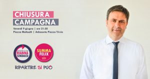 Salvatore Rianna (Rianna Sindaco, Summa Felix) alle 21, 30, chiuderà la sua campagna elettorale in piazza Matteotti. «Sarà l’ultima occasione – dice – per spiegare ai cittadini il nostro progetto di città. Lo faremo in piazza Matteotti, luogo che la storia di Somma ha eletto come teatro dell’agone politico della città».