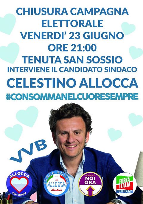 Allocca, sostenuto da Forza Italia, Allocca per Somma, Noi Ora e Forza Somma, chiuderà la sua campagna elettorale del ballottaggio alla Tenuta San Sossio (via San Sossio, 1). Una «festa» insieme ai cittadini, con candidati, sostenitori ed esponenti politici delle sue liste. «Prima percorrerò ancora le strade della città – dice il candidato sindaco – e parlerò con i cittadini invitandoli ad esprimere liberamente e con coscienza il proprio voto».