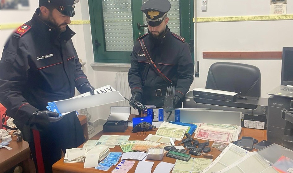 Nella sua abitazione rinvenuta una pistola con matricola abrasa, con 4 proiettili nel serbatoio e 2500 euro in contante ritenuto provento illecito. Sempre a casa hanno trovato documenti contraffatti, un notebook, alcune stampanti multi-materiale per la realizzazione di targhe, carte di circolazione e documenti di identificazione falsi. In un furgone parcheggiato fuori casa è stato rinvenuto tutto il materiale necessario a rubare i veicoli e modifciare telaio e targa. Nel bilancio anche un jammer, stemmi olografici della Repubblica Italiana su carta adesiva, attrezzi per punzonare i telai, smerigliatrici.