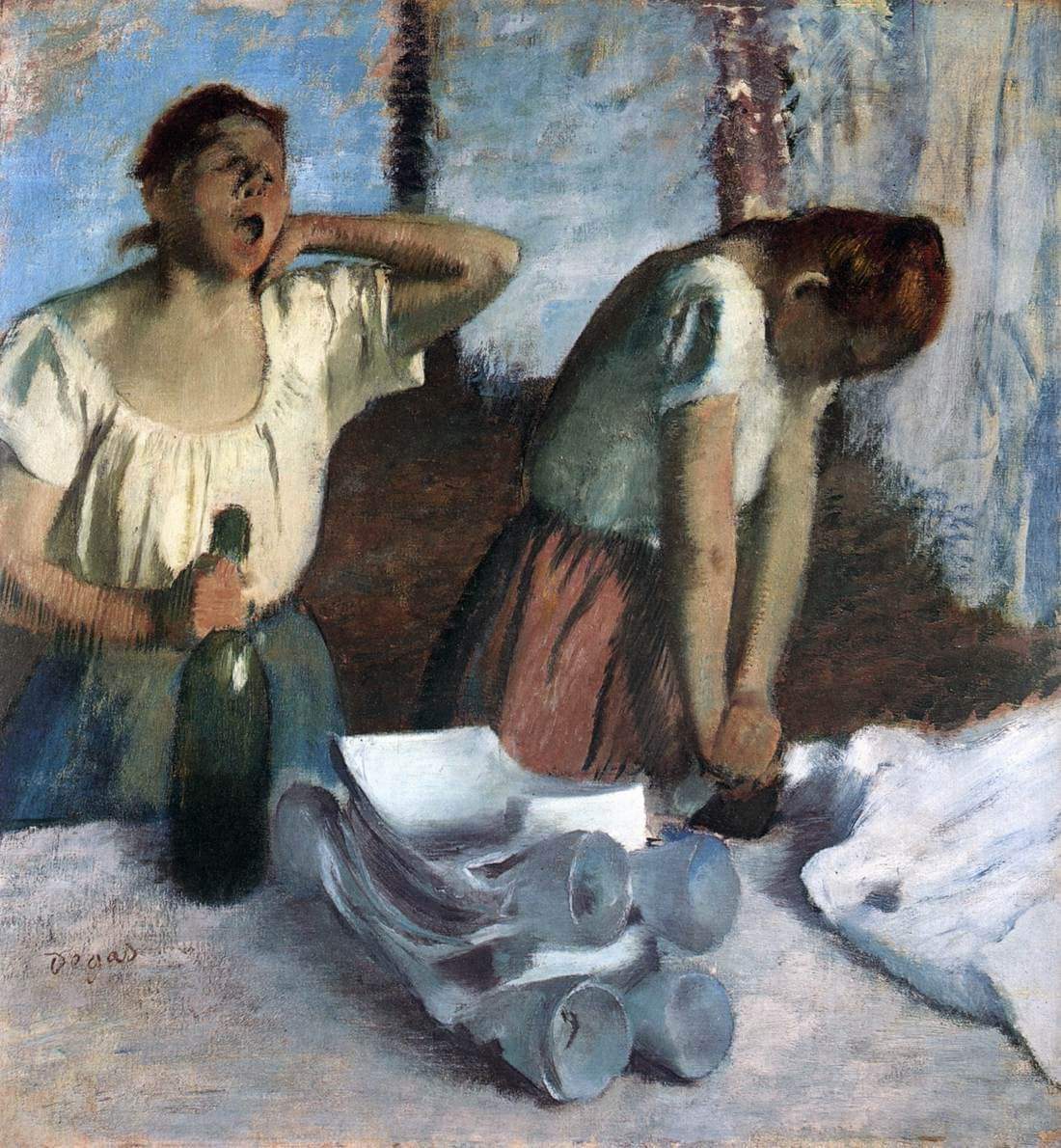 Per quasi tutti gli studiosi della lingua e della cultura di Napoli la locuzione “sciué sciué” indica una cosa fatta con “superficialità, alla buona, senza eccessivo impegno, insomma in maniera fluente, scorrevole e con semplicità”. Scrive nel suo dizionario Sergio Zazzera che “sciué sciué” significa “superficialmente, sommariamente, con leggerezza, senza impegno”. In un sito in cui si parla di canzoni napoletane leggo che nel 1957 Ferdinando Albano e Ettore De Mura composero “Serenatella sciuè sciué” “ in un paio d’ore e senza particolare impegno”: eppure la canzone riuscì piena di piacevolezza e di grazia, “gradevole e orecchiabile”: “sciué sciué” “sta a indicare un modo di fare veloce, pratico, senza molte pretese, ma estremamente efficace”. Si sente chiaramente, in questi commenti, lo stridio delle contraddizioni, e forse l’ indagine etimologica potrà rendere lineare e coerente la sequenza dei significati. Non prendiamo in considerazione l’ipotesi che la locuzione derivi dal verbo francese “échouer”, che suona più o meno in modo simile, ma significa “fallire”, e dunque indica un campo semantico antitetico. La sola etimologia convincente è quella che fa della locuzione la trascrizione in lingua nostra di “fluens fluens”, l’iterazione del participio presente del latino “fluo” che sta a indicare, nella forma stessa oltre che nel significato, una fluidità, una scorrevolezza che non incontrano ostacoli, non conoscono intoppi. Le leggi delle variazioni fonetiche confermano l’etimologia: il gruppo “fl” tende a diventare in lingua napoletana “sc”, come dimostrano “sciummo” (da “flumen” e da “fiume”), “sciore” (da “flos” e da “fiore”) e tutti i sostantivi e i verbi dello stesso spazio semantico. Una cosa fatta “in maniera fluente e scorrevole” non si può dire che sia realizzata con “superficialità e alla buona”. Un giorno, un giornalista francese di cose d’arte notò che Degas tracciava sul disegno di una stiratrice (vedi immagine in appendice) i punti di massima luce manovrando il pastello bianco e quello giallo con una rapidità frenetica, come se la mano fosse guidata non dalla riflessione, ma dal caso: e ne parlò all’artista. Il quale, continuando a disegnare macchie e linee con i pastelli, ribatté che egli non faceva altro che riportare sulla carta i segni che già aveva tracciato sul corpo della stiratrice nella sua mente: l’artista che, mentre lavora all’opera, si ferma a pensare, a riflettere, dimostra di non aver dentro di sé l’immagine chiara di ciò che vuole rappresentare. E potremmo ricordare che Lorenzo Bernini usava spesso il termine “fluens” per indicare la miracolosa fluidità delle linee che segnano, nelle sue sculture, lo snodarsi dei volumi. E “fluens” è, in filosofia, lo scorrere del tempo, del tempo esterno, del tempo interiore. L’azione rapida e fluida non è sempre impulso superficiale: al contrario, essa è spesso l’atto in cui si realizza, al di là di ogni dubbio e di ogni incertezza, l’idea a lungo meditata e precisamente disegnata in ogni particolare. Non ci vuole molto tempo per cucinare gli spaghetti “sciuè sciuè”, perché l’inventore della ricetta la pensò e la descrisse come una sinfonia, nota per nota. E poco fa notavo, sullo schermo del computer, che Von Karajan dirigeva talvolta come se pensasse ad altro, e fosse distratto. Ma le sue mani eseguivano, d’istinto, il moto “fluens” e “chiamavano” dagli strumenti la musica.