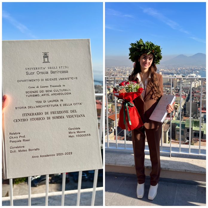 Somma Vesuviana. Maria Maione, giovane cittadina sommese, omaggia la sua terra rendendola oggetto di studio della sua tesi di laurea triennale. Maria si è laureata il 20 dicembre scorso in Scienze dei Beni Culturali, Turismo, Arte, Archeologia all’Università Suor Orsola Benincasa, con una votazione di 110 e lode su 110. Il suo elaborato finale in “Storia dell’Architettura e della Città” reca il titolo “Itinerario di Fruizione del Centro Storico di Somma Vesuviana” e analizza lo sviluppo urbano del centro storico di Somma, con l’intento di valorizzarlo e di documentare lo stato di conservazione degli edifici.