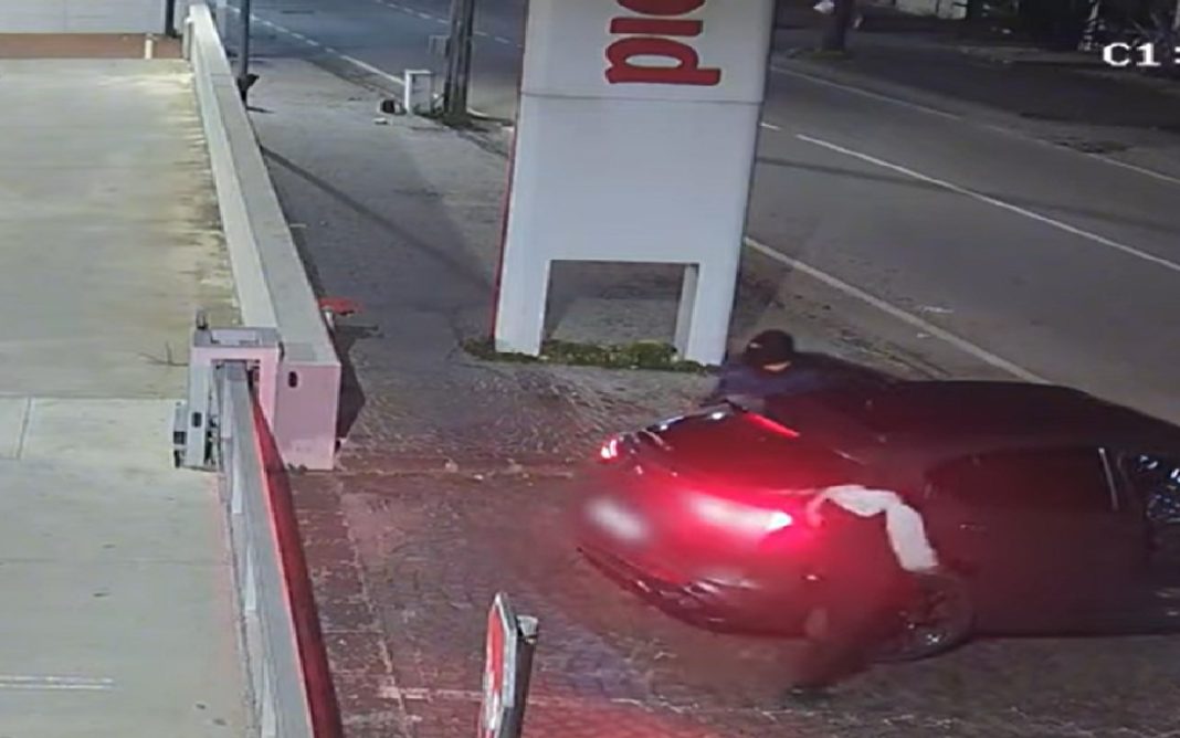 Dalle immagini di videosorveglianza si notano due individui con il volto coperto che scendono dall’auto e si avvicinano al cancello per verificare la presenza di sorveglianti all’interno dell’area.