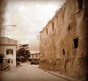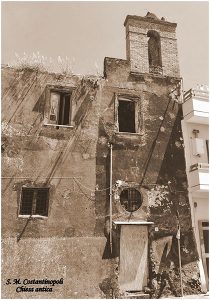 “L’ intero complesso, di cui mi sono già occupato abbondantemente nell’articolo riportato nella rivista n°5 di Summana, e a cui rimando per ulteriori approfondimenti, prospetta con la facciata e l’ingresso principale su una piazzetta, su cui è posizionato un ampio sagrato composto da tre ampi gradoni che conducono in chiesa. Già a partire dagli anni ’50 del Novecento, vi erano preparativi di progetto per lo spostamento del complesso religioso, che era collocato in un luogo decisamente pericoloso per l’incolumità pubblica. Infatti, la struttura, oltre ad essere ubicata nel bivio di due strade, di cui una ormai non più funzionante, si trova al margine di una doppia curva che toglie visibilità al traffico automobilistico. Bisogna aggiungere, inoltre, che la mancanza di un marciapiede non consente un agevole transito sia ai pedoni che agli alunni della vicina scuola elementare. Sembra incredibile, ma i piccoli studenti sono obbligati ad invadere l’importante sede stradale. I resti della chiesa, senza alcuna precauzione, continuano inesorabilmente a degradarsi con il costone dell’angolo della chiesa che ormai presenta in sommità profonde lesioni. A ciò aggiungo la mancanza di un elemento strutturale di freno della ormai inesistente copertura”.
