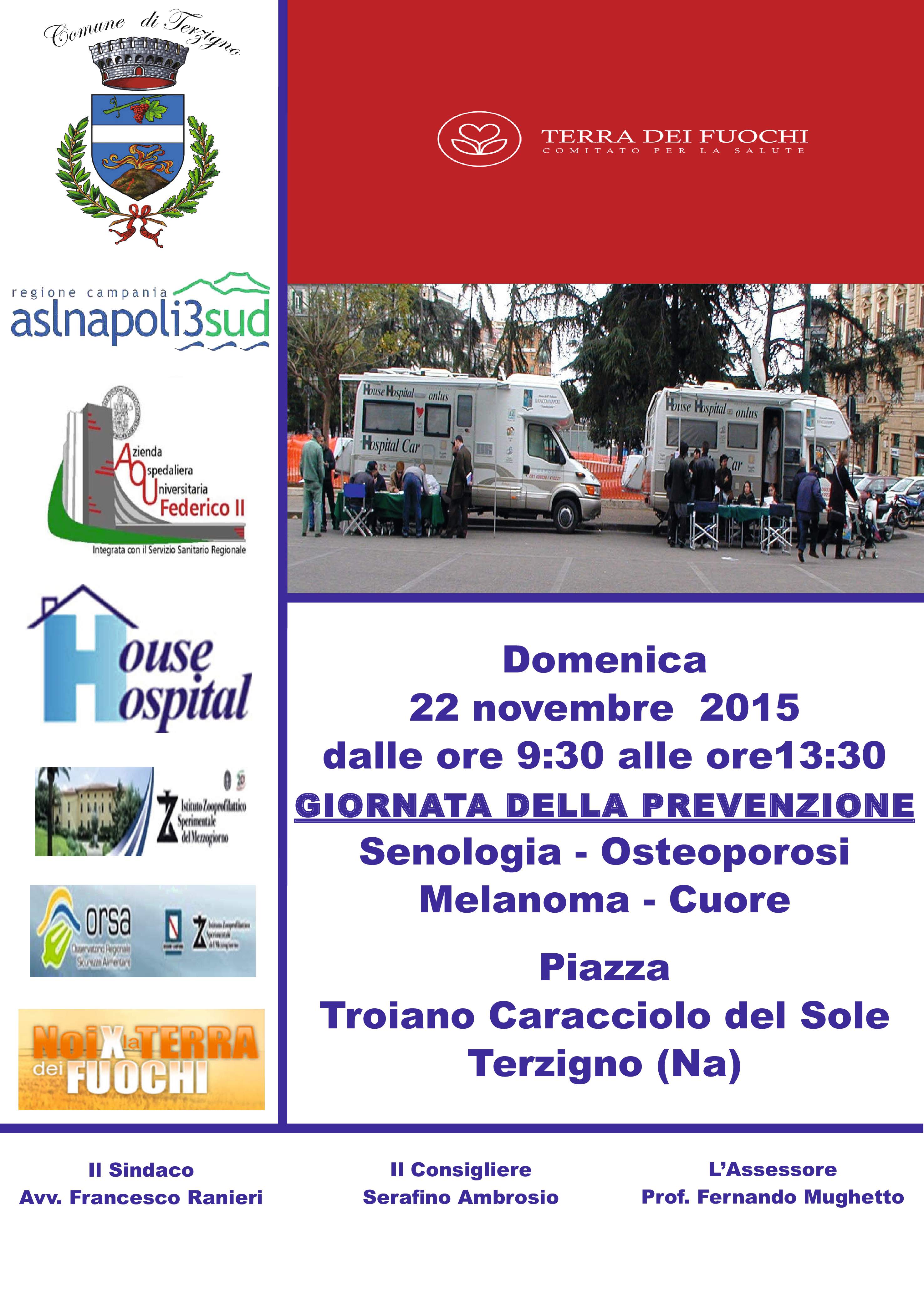 Domenica, 22 novembre 2015, dalle ore 9:30 alle ore 13:30, a Terzigno, in Piazza Caracciolo del Sole, avrà luogo la “Giornata della Prevenzione”.