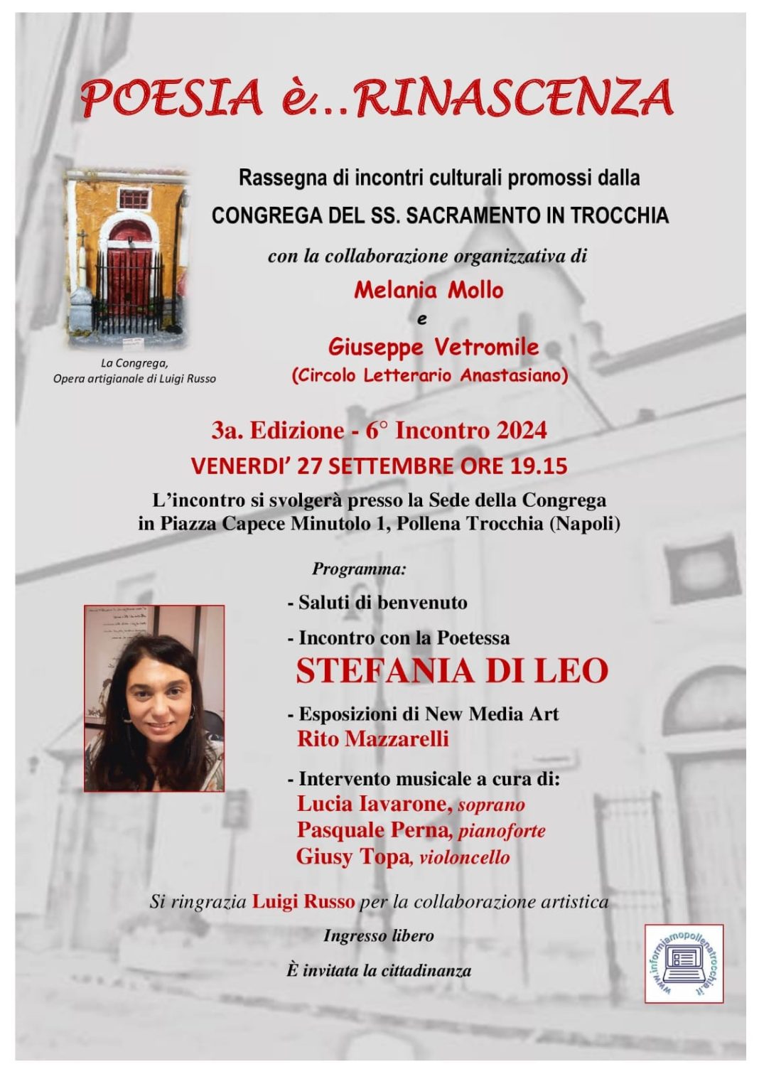 Riprendono, dopo la pausa estiva, gli appuntamenti della rinomata e apprezzata rassegna culturale “Poesia è… Rinascenza”, ideata e condotta dall’operatrice culturale Melania Mollo con la collaborazione del Circolo Letterario Anastasiano di Giuseppe Vetromile.