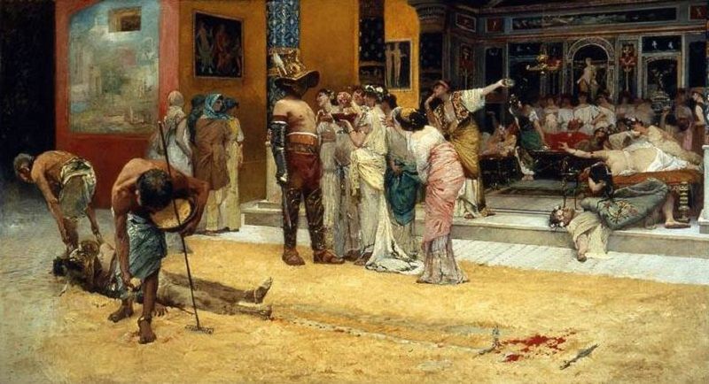 Nel quadro Francesco Netti ha messo insieme storia, dramma e teatro. Il nostro sguardo entra nella “scena” dall’angolo in basso a sinistra e va verso il fondo, seguendo il “movimento” non lineare delle pareti. Dunque, il primo piano è del gladiatore sconfitto e ucciso, che viene trascinato via, come se fosse un mucchio di resti del banchetto, da un servo:l’altro servo pulisce il pavimento. La postura dei due servi contribuisce a fermare la nostra attenzione sul corpo dell’ucciso. Il piano intermedio del quadro è occupato dal gladiatore vincitore, circondato da donne che gli fanno festa e si congratulano con lui: con raffinato senso del teatro il pittore non ci mostra il volto, perché il vincitore sta tutto nella posa a busto dritto, nel gladio che è parte integrante del braccio teso, nell’elmo “clamoroso”. Una donna, con la mano sinistra, ci indica l’ultima parte della sala, che è rialzata rispetto alla prima ed è segnata dal marmo e da lastre bianche: nell’ombra si muovono, indistinti, i banchettanti, e una donna seminuda e un convitato steso a terra da un’arma micidiale, il vino, portano il nostro sguardo verso l’angolo in basso a destra, che “chiude” il quadro e la scena con la macchia di sangue e con l’arma del gladiatore ucciso. Mariateresa Mormone scrive che anche questa opera porta il segno della “crisi espressiva del verismo che utilizza il quadro di storia per esprimere contenuti morali”. Non si può escludere, tuttavia, che Netti non alluda alla spietata indifferenza di molti suoi contemporanei, ma tenga conto di ciò che scriveva Seneca in una lettera a Lucilio (1, 7) sulla crudeltà che era diventata, per il pubblico romano, il “condimento” più importante dei combattimenti tra gladiatori. Nel Circo “la mattina gli uomini sono gettati in pasto a orsi e a leoni, a mezzogiorno ai loro spettatori.” E Seneca, avendo frequentato per strada e sugli spalti altri uomini, torna a casa “più crudele e disumano”. Le fonti non ci dicono nulla sull’argomento, ma non si può escludere che in età imperiale duelli di gladiatori si svolgessero anche nelle case dei potenti. Dal suo Maestro Domenico Morelli il pugliese Francesco Netti (1832- 1894) apprese l’arte dell’impaginazione e della coordinazione dei dettagli: sull’arena artificiale costruita nella sala il corpo trascinato lascia un solco chiuso da “vive” macchie di freddo carminio – il sangue dell’ucciso – che contrastano – ed è un contrasto che ha valore di metafora – con la tessitura cromatica del primo piano, dominata dai toni “caldi” che vengono dall’ ocra gialla, usata dal pittore per l’imprimitura della tela e per il colore base dei corpi nudi e dei volti. Colori particolari di veli e di mantelli – il rosa, il verde e il celeste – servono a creare corrispondenze con la “densa decorazione pittorica alla pompeiana del III stile” (M. Mormone) che si sviluppa sulle pareti e che consente a Netti di dimostrare la sua notevole abilità tecnica: nel primo piano del quadro egli usa una pittura realistica, attenta ai passaggi graduali dalla luce all’ombra e ai particolari (per esempio, i muscoli dei due servi, l’abbigliamento del gladiatore vincitore e le vesti delle donne che gli fanno corona); nel secondo piano il colore viene steso con piccoli pennelli e a rapidi tratti, secondo la tecnica degli impressionisti che Netti aveva studiato a Parigi. Le brevi pennellate di bianco, che “formano” le figure del fondo, ricevono unità e coerenza dal blu della parete pompeiana. “La nostalgia dell’antico” fu importante nella cultura europea, e in particolare in quella inglese, nel secondo Ottocento e nei primi anni del Novecento. Come ci ricorda Eugenia Querci, Leyghton e Watts dipinsero “soggetti mitologici o epici del mondo greco”, mentre Alma- Tadema, dopo il viaggio in Italia del 1863 – durante questo viaggio visitò gli scavi di Pompei – preferì rappresentare l’archeologia del mondo romano “nella sua anonima ma affascinante quotidianità”. Egli diceva che solo l’archeologia poteva consentirgli di “far rivivere la vita antica” e di creare scene che fossero non solo possibili, ma anche probabili. A questo “genere pompeiano”, che ispirò anche importanti pittori italiani, come il Netti, dedicheremo altri articoli.