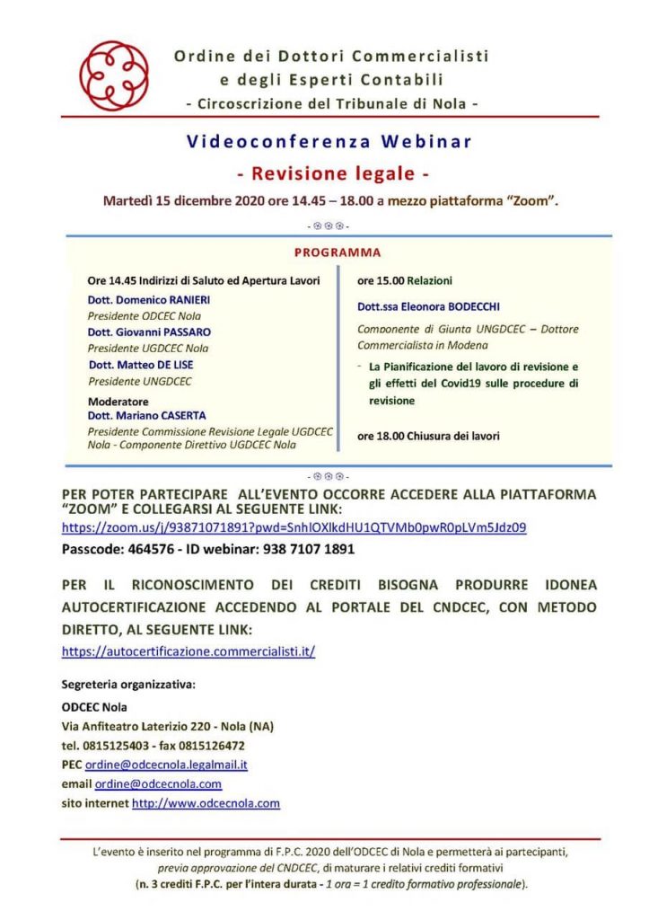 Domani, martedì 15 dicembre, dalle 14, 45 alle 18 su piattaforma Zoom, videoconferenza webinar sulla «Revisione Legale» organizzata dall’Unione Giovani Dottori Commercialisti di Nola guidata dal presidente Giovanni Passaro, in collaborazione con l’Ordine dei Dottori Commercialisti di Nola: i partecipanti potranno maturare crediti formativi obbligatori. Moderatore dell’evento sarà il dott. Mariano Caserta, presidente della Commissione Studio Revisione Legale UGDCEC di Nola.