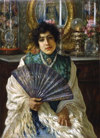 Vincenzo Migliaro non nasconde la peluria sul labbro superiore della donna che nel quadro che correda l’articolo è ritratta come una ricca borghese: la prospettiva ravvicinata, “famigliare”, ci conferma che la donna è Adalgisa, la sorella del pittore. Il ventaglio ha la funzione di guidare l’attenzione di chi osserva sulla collana, sul cammeo e sul volto. Non si può dire che sia un volto bello, e il pittore ne ritrae le linee naturalisticamente: egli sa che la bellezza, malinconica e fragile, della sorella sta tutta nei grandi occhi, gli occhi che “hanno guardato Dio”. La peluria sul labbro superiore ci parla dei saldi costumi morali della donna, confermati del resto dalla lampada accesa davanti all’immagine della Vergine Addolorata: come ci dicono i verbali di polizia di fine Ottocento, solo le donne di malaffare usavano depilarsi integralmente. Ma quella peluria, segno di un florido vigore ormonale, ci dice anche che Adalgisa è donna da marito, è preparata al ruolo di Madre: non a caso il comò e la campana di vetro ci ricordano che la donna sta nella sua camera da letto, raffigurata da Migliaro anche nel quadro “Donna allo specchio”, e che la pudicizia, rappresentata dai fiori secchi sotto la campana, purifica la sensualità, di cui sono simboli la caraffa con l’acqua per i fiori freschi, gli anelli, lo scialle elegante, e la bocca dipinta con un tocco di squillante carminio: e visto che c’è, questa peluria viene usata dal pittore anche per sottolineare la vitalità fascinosa di quelle labbra.
