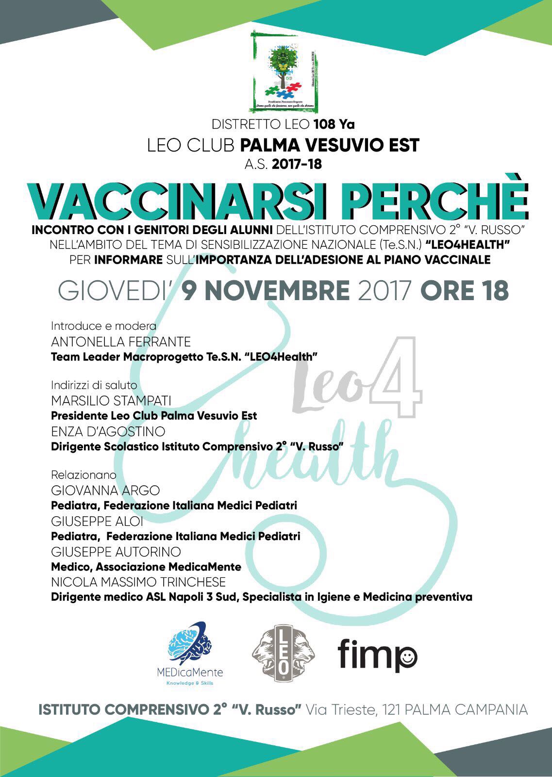 I genitori degli alunni incontreranno mediti specializzati in materia. Per l’occasione, interverranno il dirigente medico dell’Asl Napoli 3 Sud, Nicola Massimo Trinchese, specialista in igiene e medicina preventiva, poi due pediatri della Federazione italiana mediaci pediatri, Giovanni Argo e Giuseppe Aloi, e Giuseppe Autorino, medico dell’associazione Medicamente. L’evento è stato organizzato da Leo Club “Palma Vesuvio Est”, nell’ambito del tema di sensibilizzazione nazionale “Leo4health”, per informare sull’importanza dell’adesione al piano vaccinale