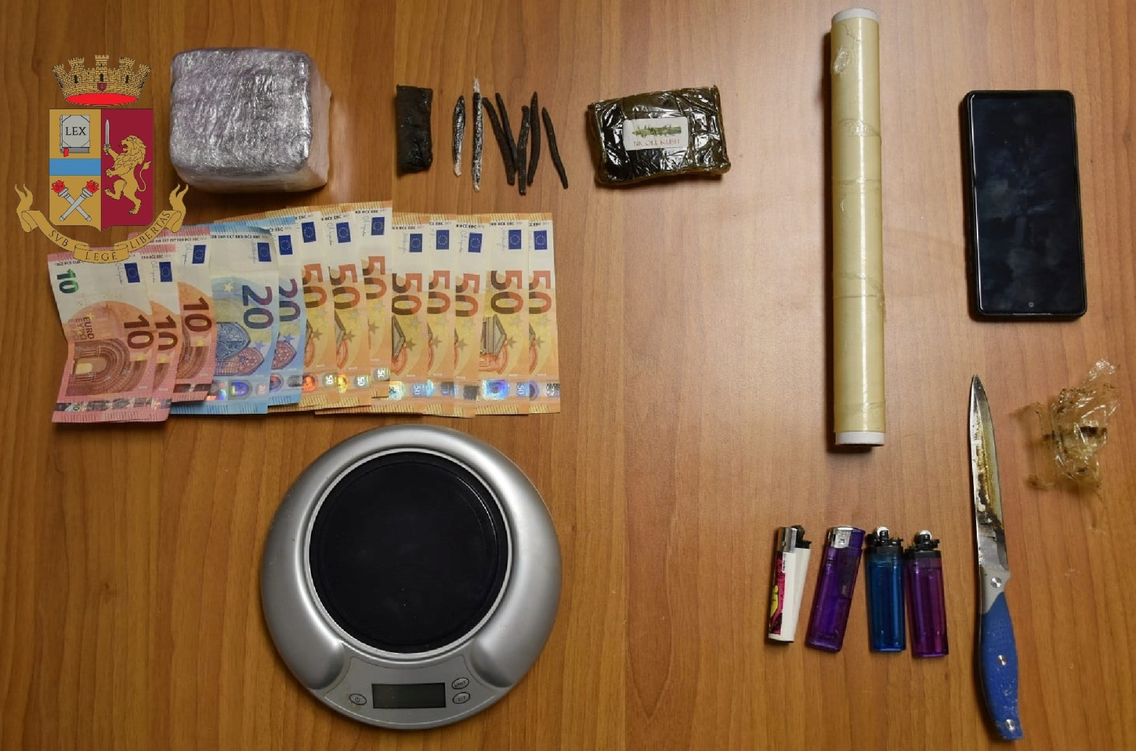 I poliziotti hanno bloccato lo spacciatore trovandolo in possesso di una stecca della stessa sostanza del peso di circa 1,5 grammi e 470 euro; inoltre, hanno effettuato un controllo presso la sua abitazione dove hanno rinvenuto altre 5 stecche e 6 panetti di hashish per un peso complessivo di circa 600 grammi, un bilancino di precisione, un coltello con la lama intrisa di sostanza stupefacente e diverso materiale per il confezionamento della droga.