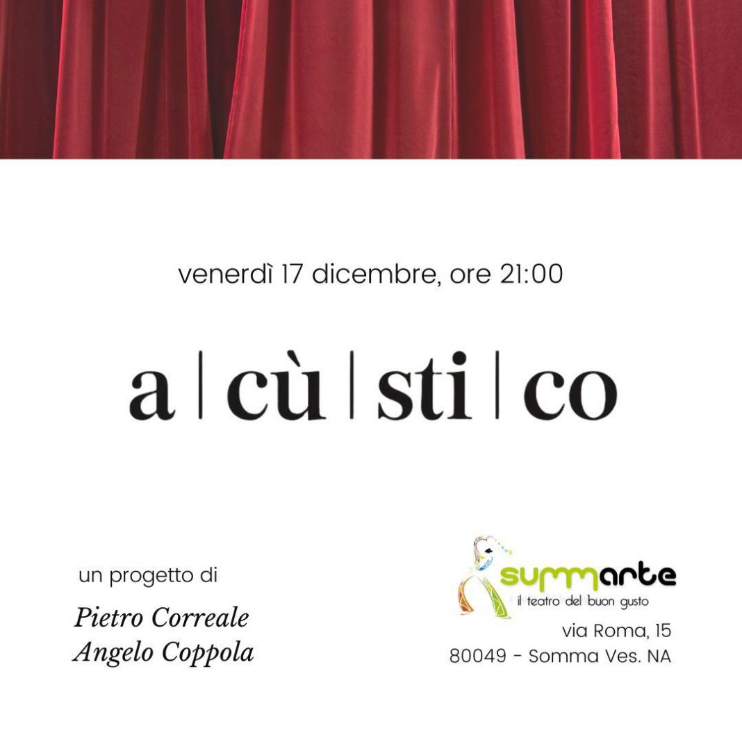 «“Acustico” è un evento che si presenta come manifesto di rinascita per l’arte a tutto tondo. Rinascita dopo quasi due anni in cui il mondo dello spettacolo è stato messo a dura prova. Non a caso si terrà in teatro, presso il teatro Summarte di Somma Vesuviana. Molteplici le partecipazioni, per omaggiare l’arte sotto più aspetti: opere d’arte, danza, musica, canto, recitazione. Rinascita per i ragazzi, quindi, che si mettono a nudo attraverso l’arte stessa. Adatta a qualsiasi tipo di pubblico, la serata sarà appunto in “acustico”, pianoforte e voce. Tema principale “la rinascita” di giovani artisti, per i giovani, e non solo», una rinascita che è sinonimo di ripartenza, soprattutto dopo il periodo buio vissuto a causa della pandemia.