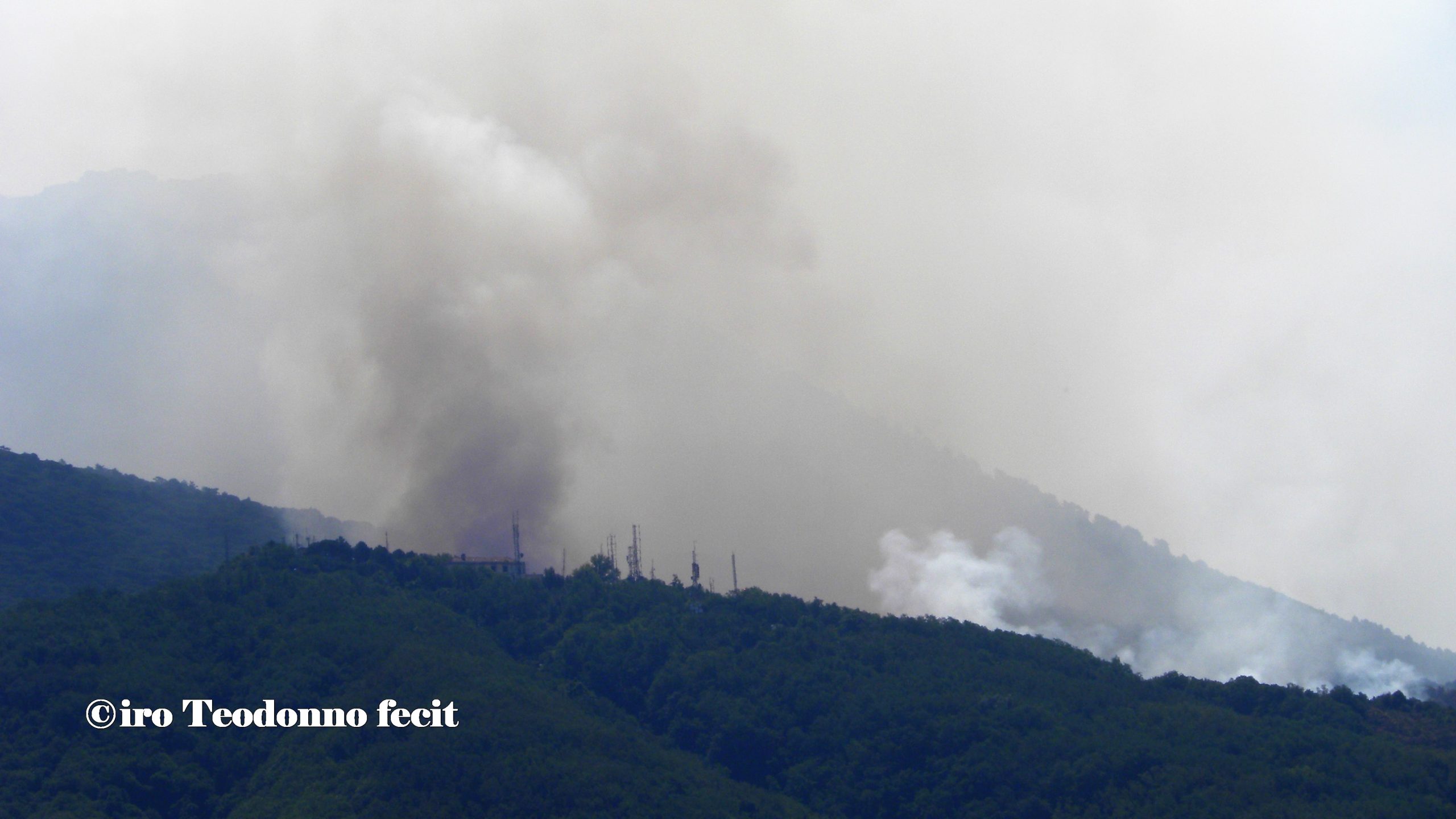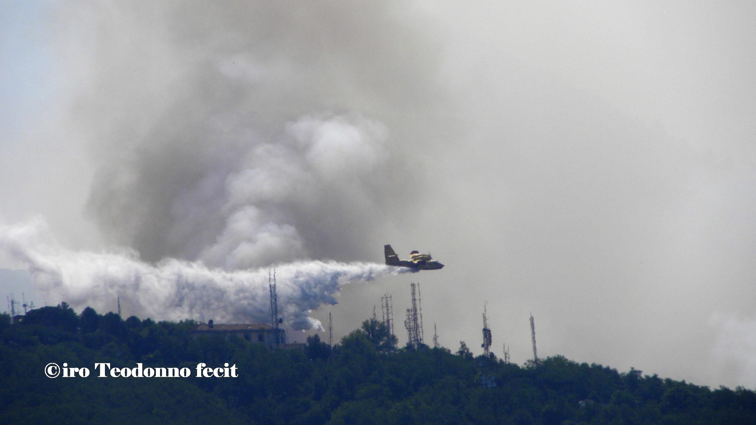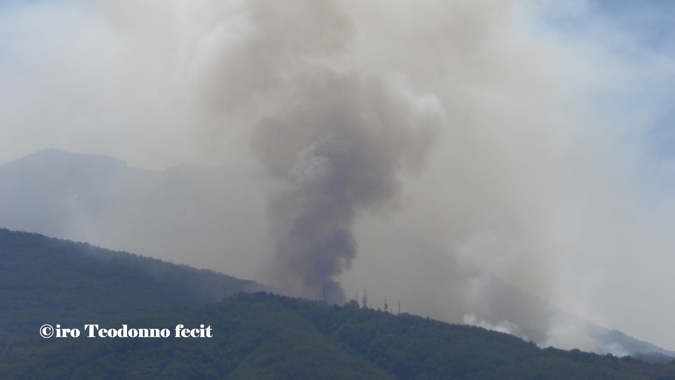 Oggi vola sulle nostre teste un solo Canadair che fa la spola tra il Golfo e il Vesuvio, la SMA ha due moduli in avaria, la PC ha bisogno di altre squadre e una nuvola scura e minacciosa si eleva tra il Colle del Salvatore e Colle Umberto, è la riserva integrale del Tirone Alto Vesuvio che brucia.