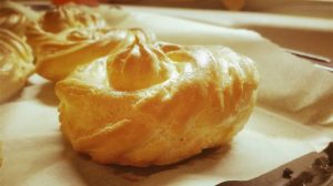 Si comincia dalla preparazione della pasta choux: un una pentola ampia mettete lo strutto (o il burro), l’acqua e un pizzico di sale. Mescolate con un cucchiaio di legno fino a quando non raggiungerà il bollore. Togliete quindi la pentola dal fuoco e unite la farina setacciata: mescolate fino a quando avrete un composto omogeneo.