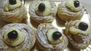 Fate quindi scaldare la crema a fuoco lento continuando a mescolare con una frusta: quando la crema si sarà addensata toglietela da fuoco e lasciate riposare. Quando si sarà raffreddata farcite con la crema le zeppole e decorate con un’amarena.